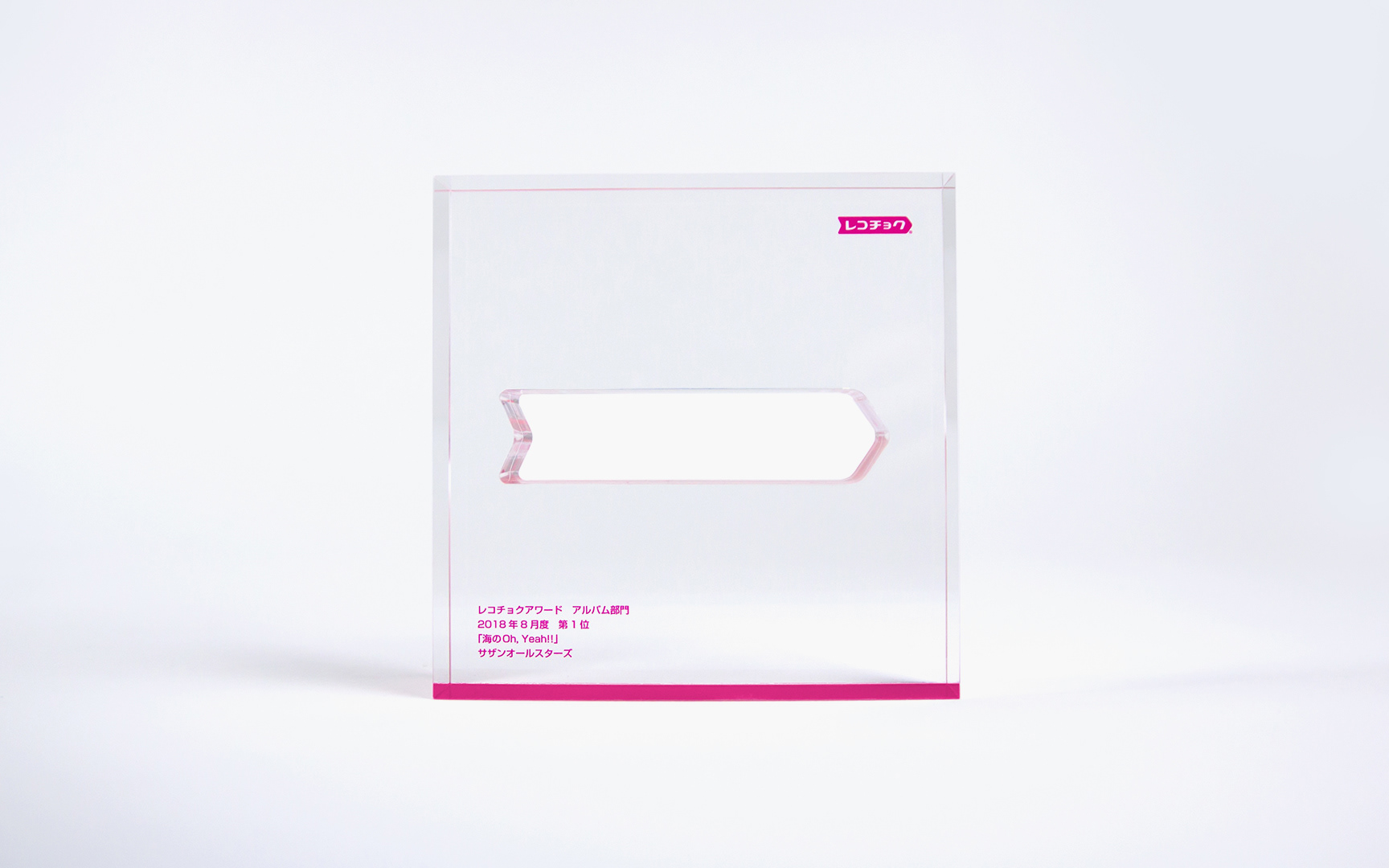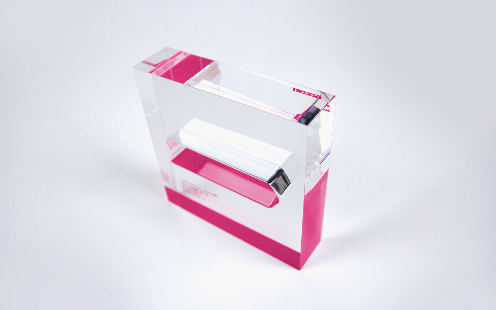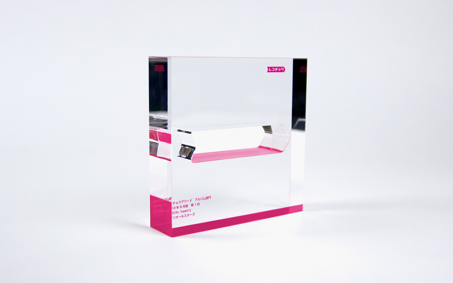 レコチョクアワードのトロフィーをデザインしました。底面に施されたブランドカラーが反射して色々な角度で映り込み、多角的な見え方がするトロフィーです。