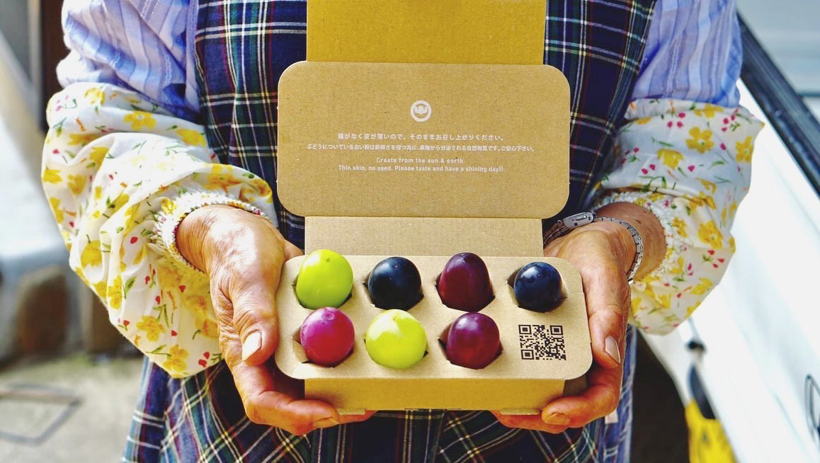 長野県須坂市の岡木農園のシャインマスカットのパッケージをデザインしました。「高級なシャインマスカットを気軽に食べてほしい」という思いから「粒売り」でのパッケージを作りました。輸送時にマスカットに傷が付かないよう、1粒ずつホールドする仕様で、気軽さがありながらも上品な佇まいのあるパッケージになりました。素材はリサイクル率の高いダンボール素材で、プラスチック不使用、接着剤不使用の脱プラスチックパッケージです。