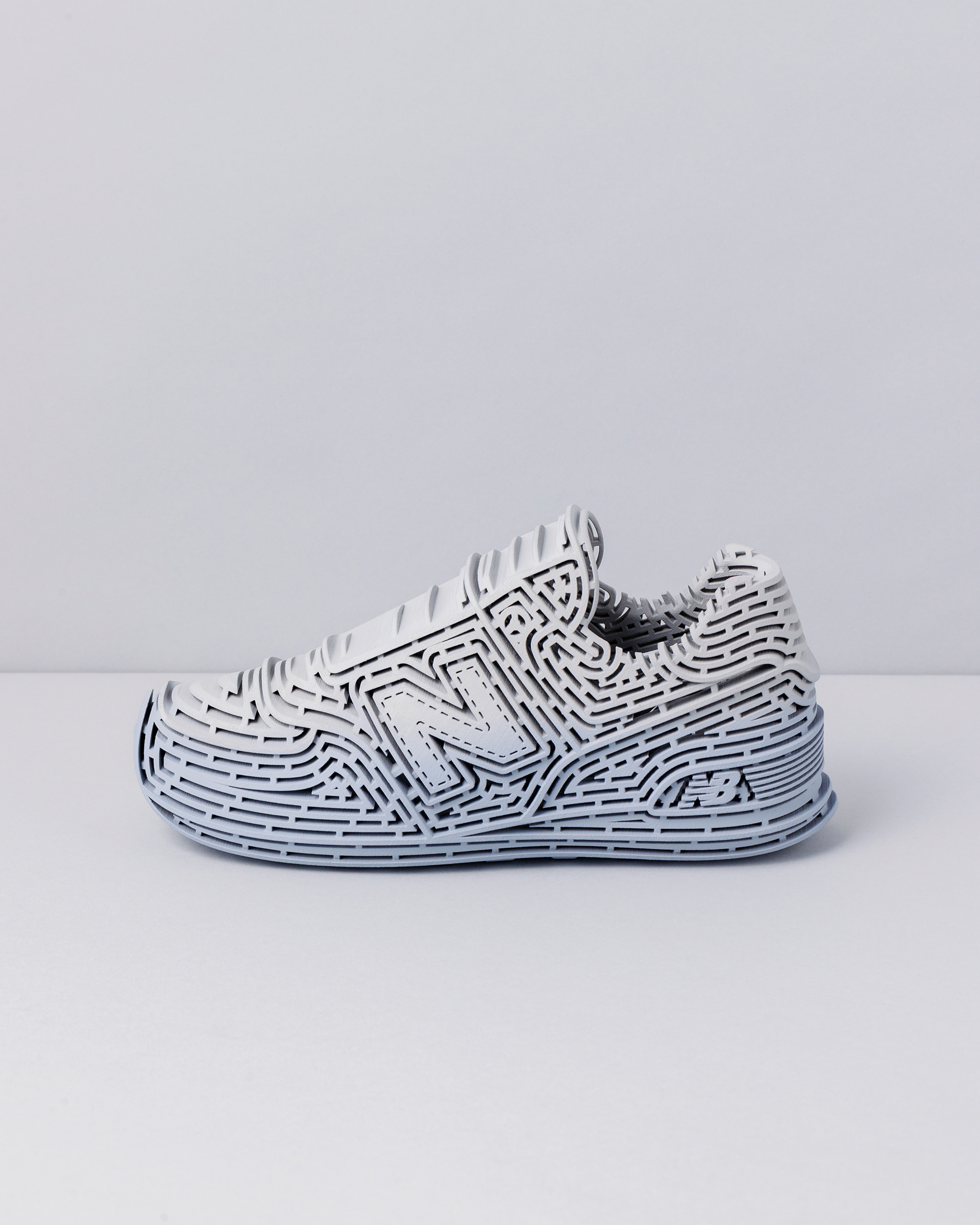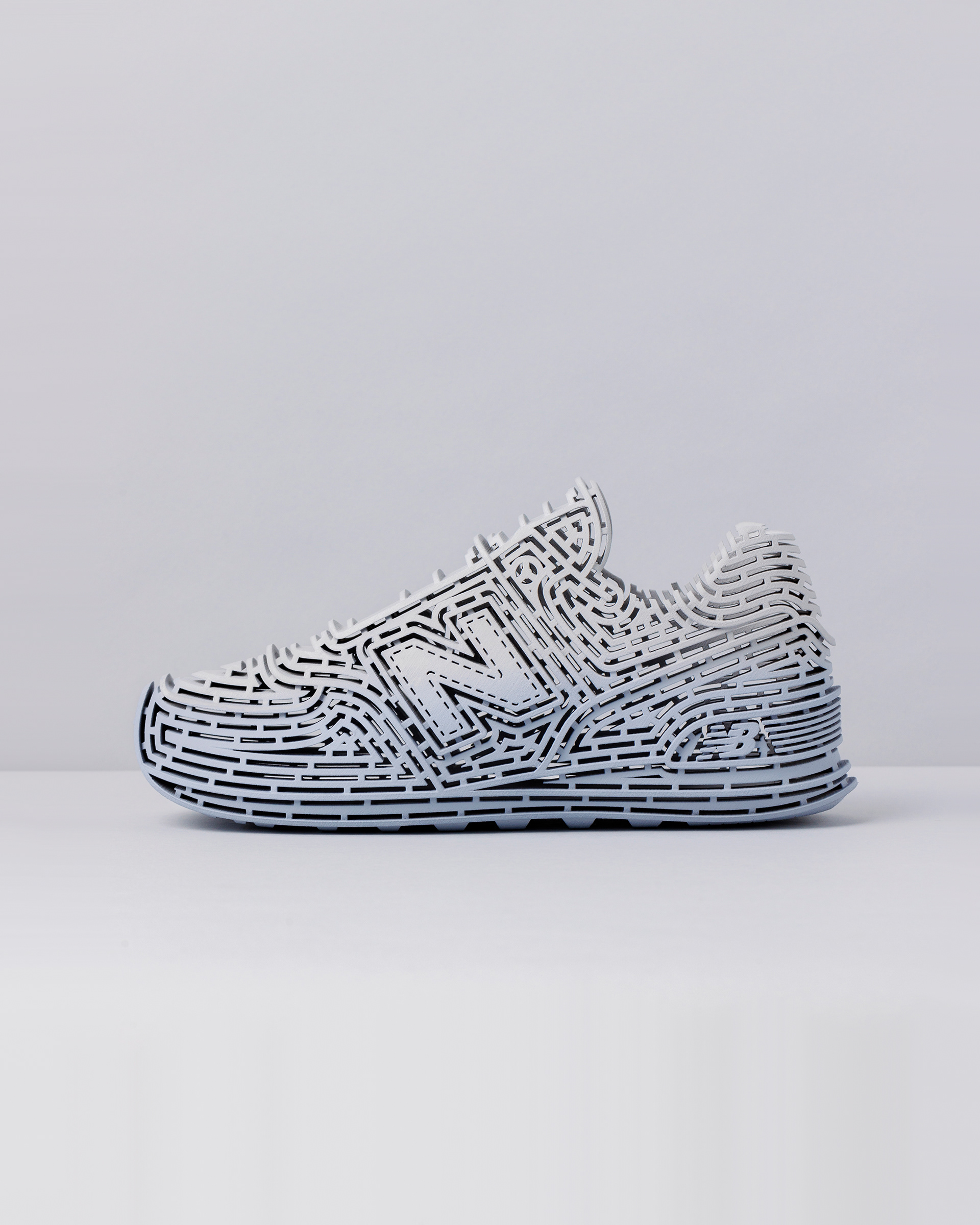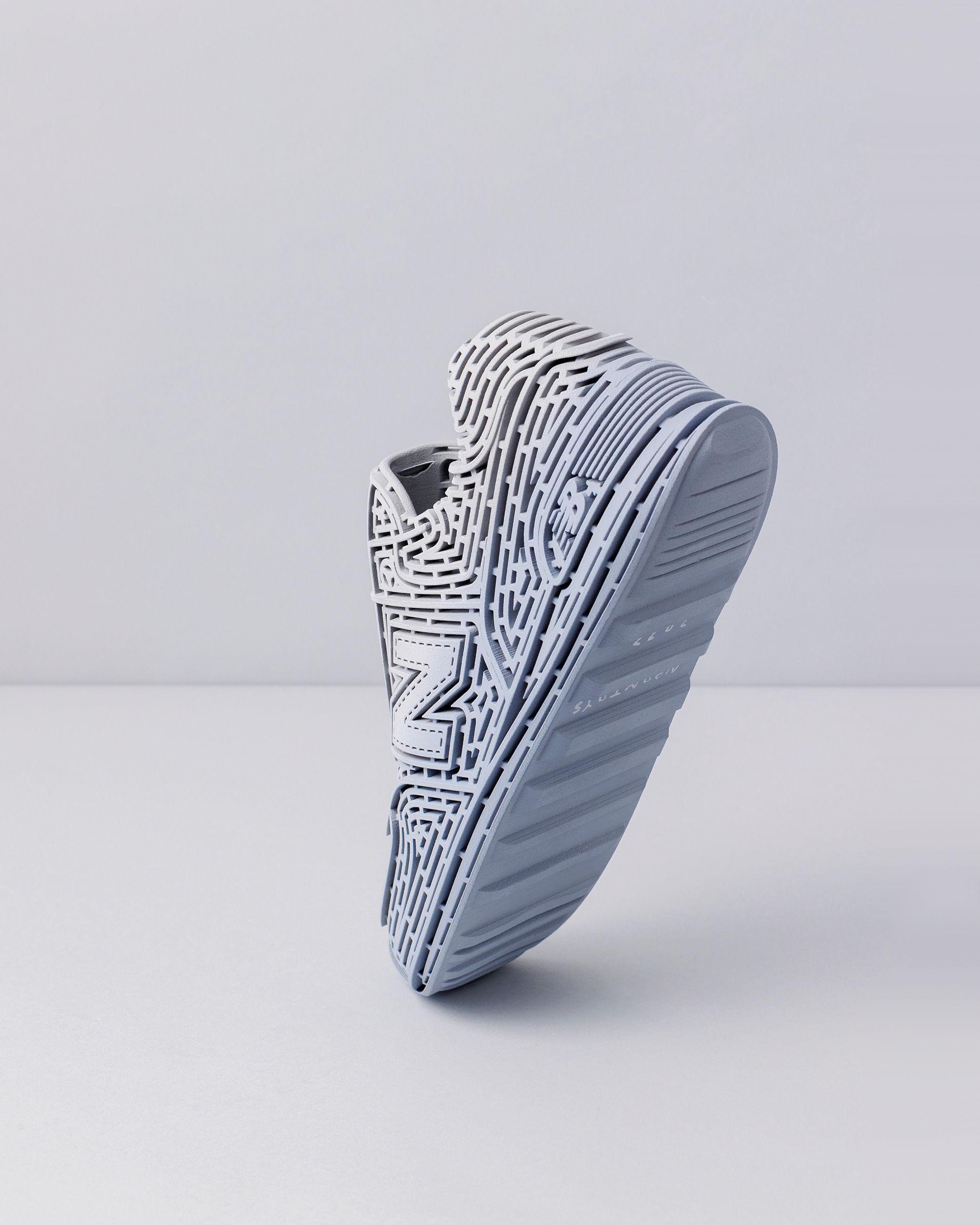 「Grey」をテーマにSLITシリーズの手法でNew Balanceの574をモチーフにした作品を制作しました。