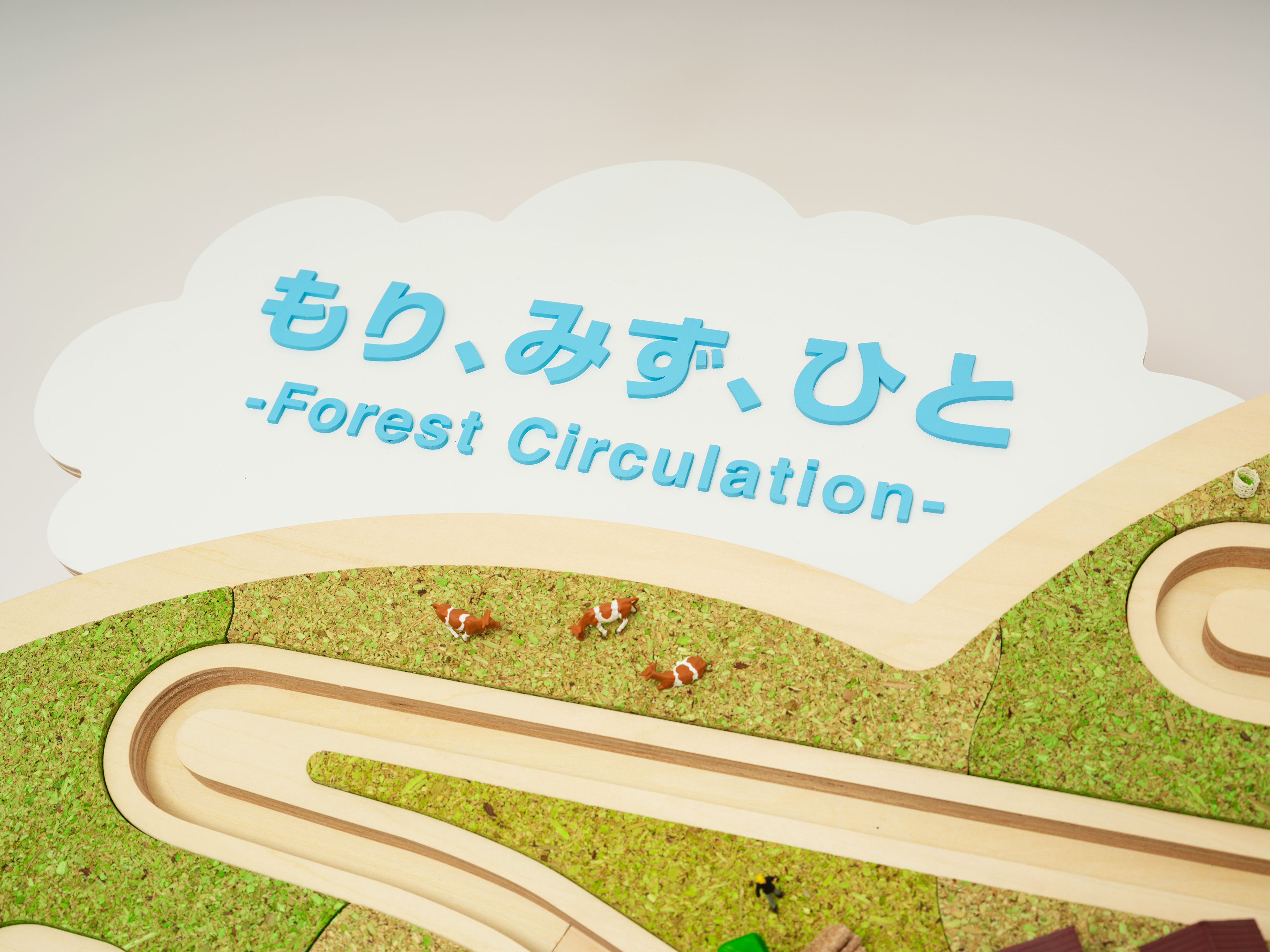 Inspired by the collaboration between Yusuhara Town, Kochi Prefecture, and Yazaki Corporation, the exhibit expresses a virtuous cycle of forests, water, and people with a diorama using materials created through the activities of both companies and a sphere running along the route.